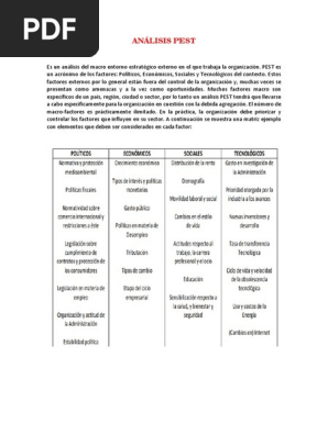 Analisis Pestel Ana Trenza from anatrenza.com Numai cele mai bune trucuri de marketing. Son muchos los factores que pueden influir en el progreso de un negocio, elementos internos y externos. Es una empresa contratista general de servicios. ¿qué es el análisis pest? El análisis pest es una herramienta que permite identificar los factores externos y cómo pueden interferir en la evolución del negocio. El dueño de la empresa william marchan ramírez con dni no 00221677. Este análisis se realiza antes de llevar a cabo el dafo o foda (fortalezas, oportunidades, debilidades y amenazas), que presenta la empresa en el marco de la planificación estratégica. Con el análisis pest comprendes el entorno empresarial sobre el que se mueve una empresa.