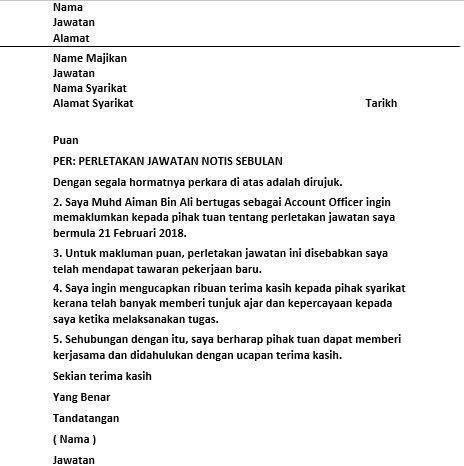 Contoh surat berhenti kerja ini adalah dalam bahasa melayu.